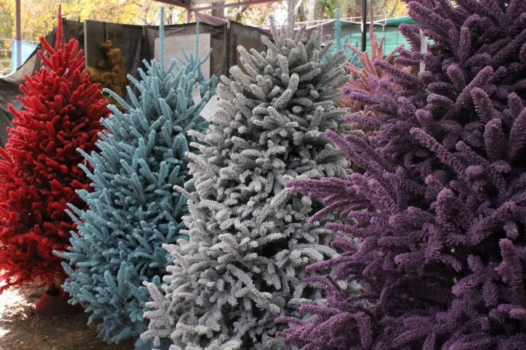 We went to a Christmas tree farm to see about cutting our own tree for the year. They unfortunately lost a bunch of tress due to the drought,  but had brought in a bunch of trees from somewhere else. They even offered to custom color flock your tree. That blue one was amazing looking in person. They even had a pink one, but much to everyone's surprise I really did not think the pink tree looked pretty.